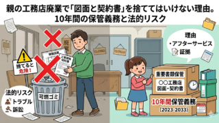 実家の工務店を廃業する際、過去の契約書や設計図面を燃えるゴミで捨てていませんか?引き渡しから10年間の瑕疵担保責任(契約不適合責任)や建設業法上の保管義務など、訴訟リスクから家族を守るための書類の仕分け方を客観的に解説します。